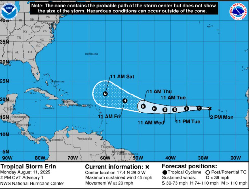 “Trayectoria pronosticada de la Tormenta Erin: se espera que en los próximos días las condiciones ambientales sean propicias para que se intensifique a huracán” escribió Ceballos en su cuenta de X..